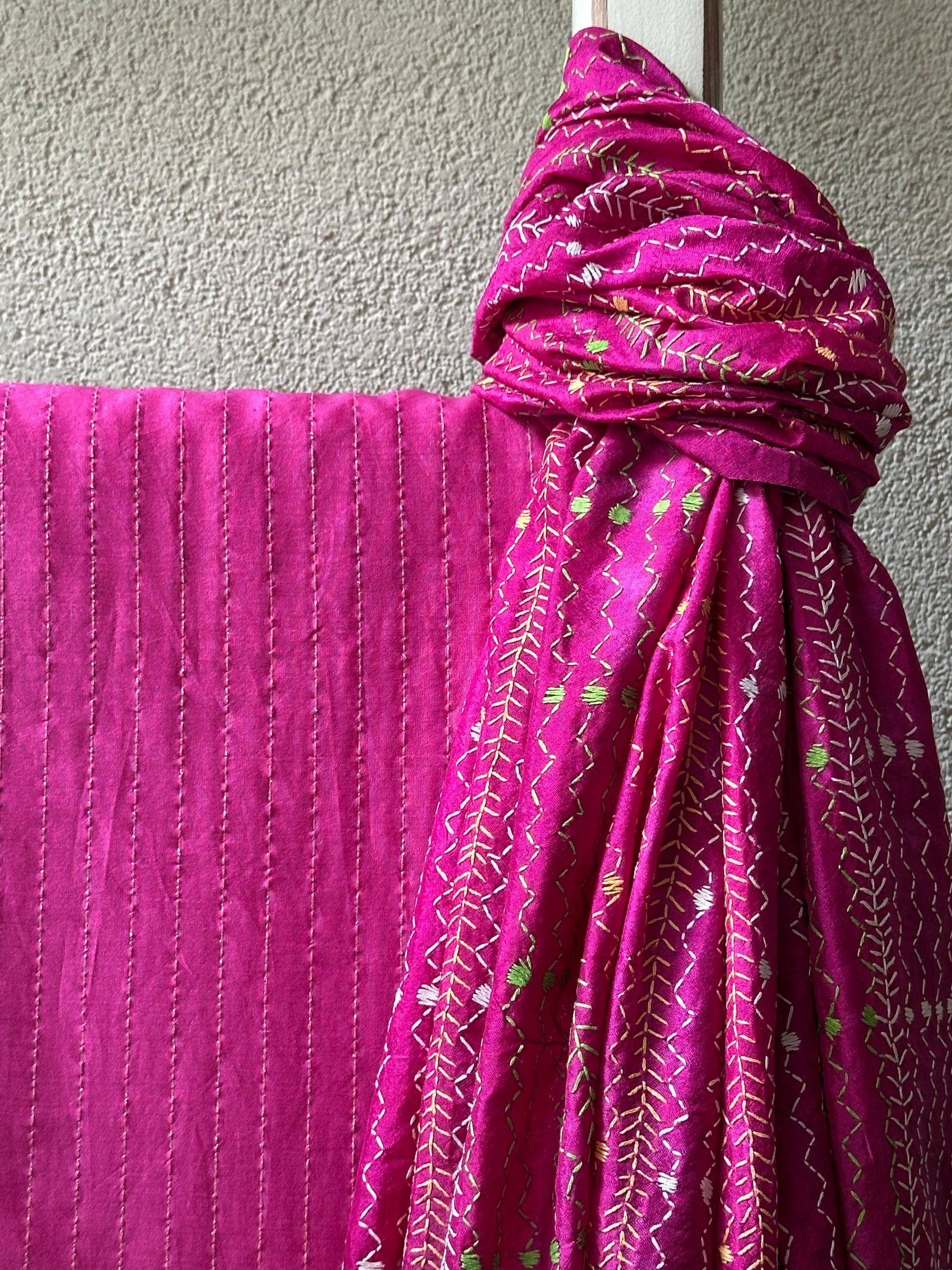 Elegant pure silk suit sets paired with beautifully Kantha dupattas. Perfect for festive occasions, weddings, and special celebrations.
