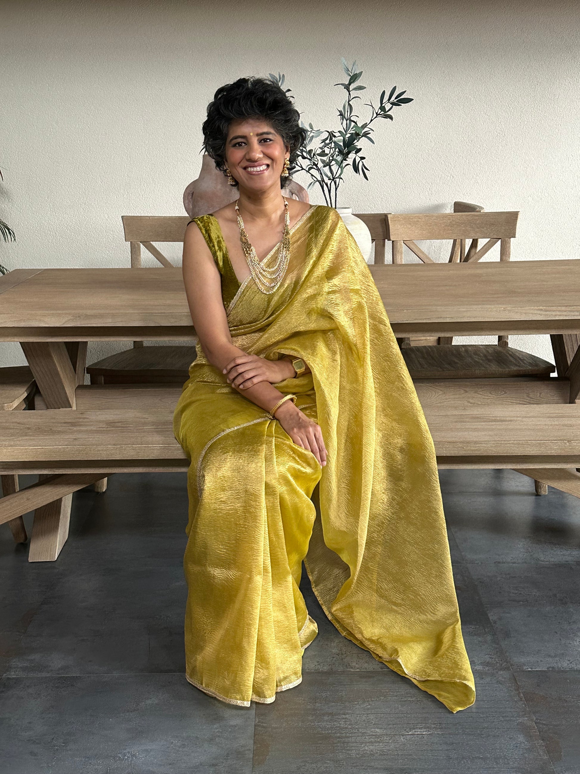 This elegant tissue sari features a rich, shimmering texture with delicate lace detailing. Crafted in our own workshop for a unique, graceful look.