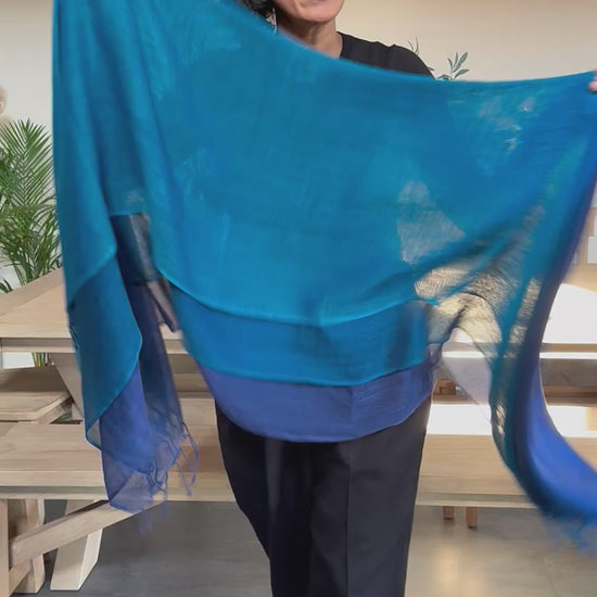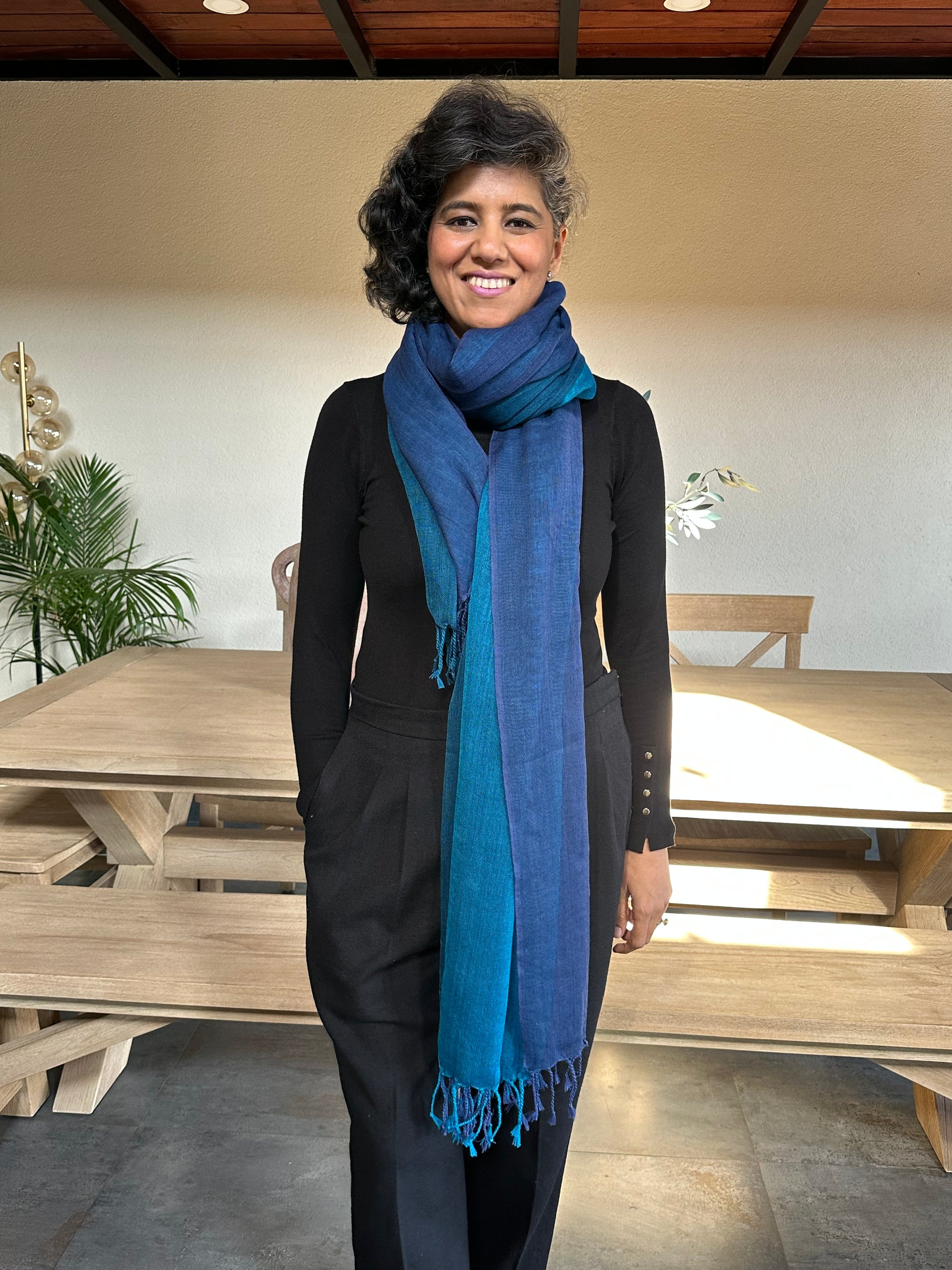 “This three-layer handwoven shawl can also be used as a stole. Open one layer and use it as a shawl, or keep all layers together and use it as a stole. A handwoven product designed for comfort and versatility, it can be worn on both sides, giving you two looks in one. Soft on the skin and easy to style with ethnic or western outfits, it is perfect for travel, office wear, or casual outings.”