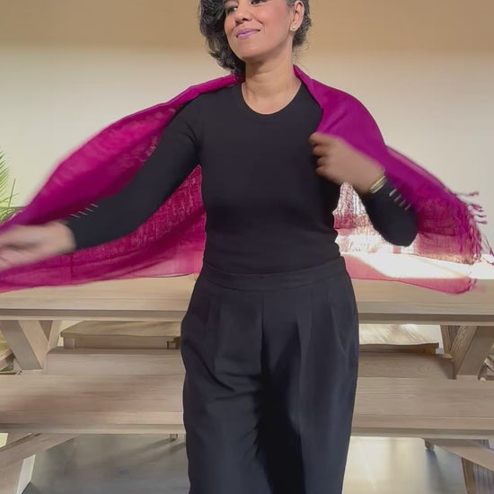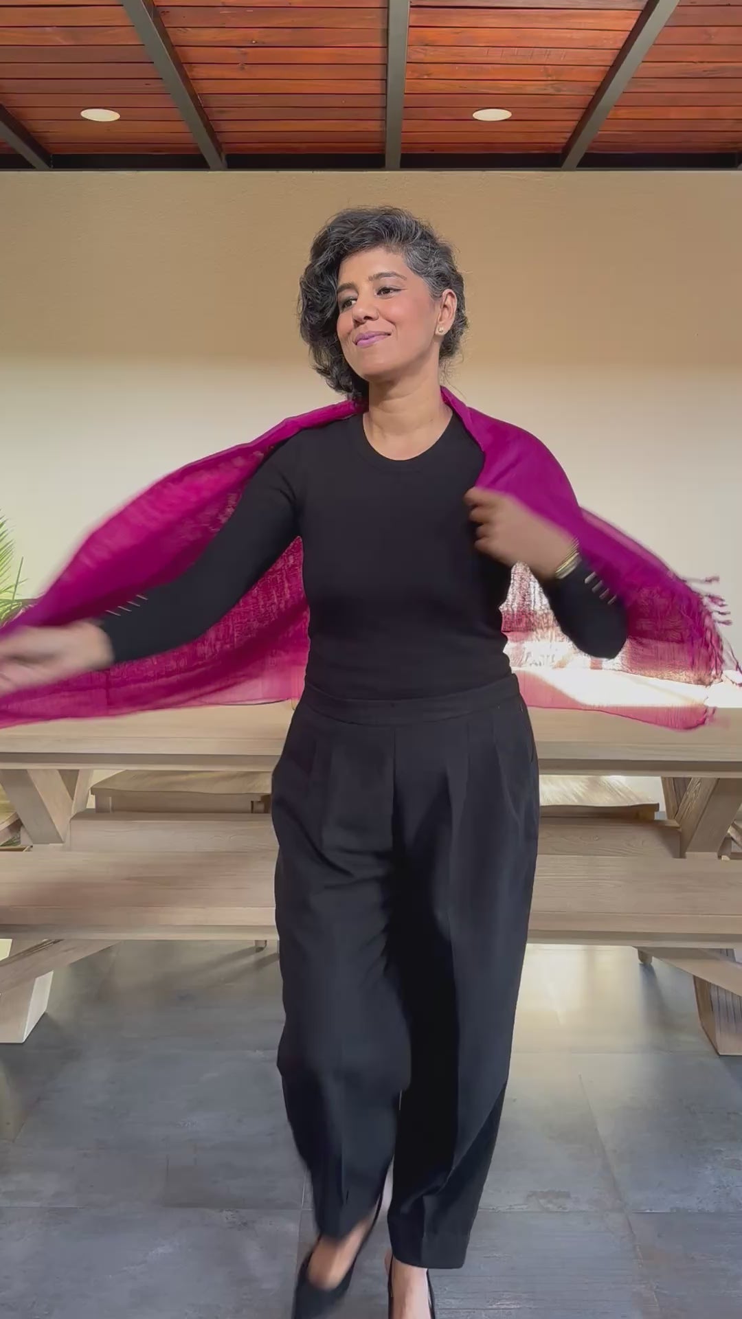 “This three-layer handwoven shawl can also be used as a stole. Open one layer and use it as a shawl, or keep all layers together and use it as a stole. A handwoven product designed for comfort and versatility, it can be worn on both sides, giving you two looks in one. Soft on the skin and easy to style with ethnic or western outfits, it is perfect for travel, office wear, or casual outings.”