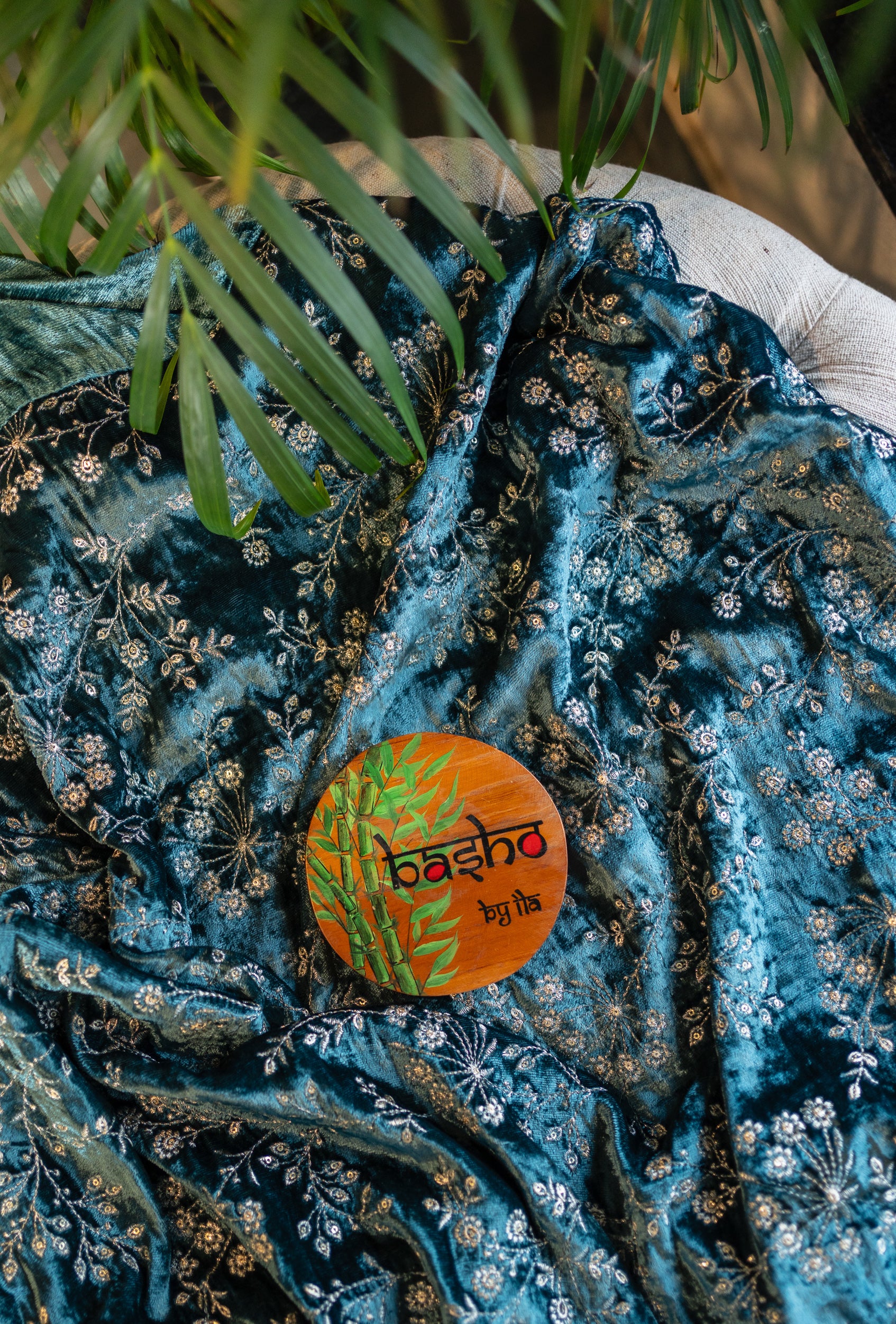 Introducing the luxurious velvet sari from BASHO by ILA. This exquisite piece, crafted in rich velvet, is elegantly adorned with a delicate lace border that adds a touch of timeless charm. Paired with a matching velvet blouse, this sari exudes sophistication and grace, making it an ideal choice for weddings and special occasions. Draped in elegance, it’s designed to make you feel both regal and radiant.