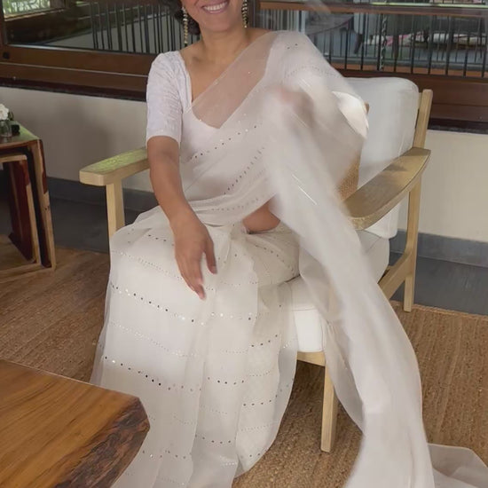 This pure silk organza saree is a timeless piece, delicately adorned with traditional mukesh work. Its sheer elegance and lightweight drape make it perfect for festive and wedding occasions. The fine craftsmanship enhances the luxurious texture of the silk organza, adding a graceful shimmer and sophistication to your wardrobe.