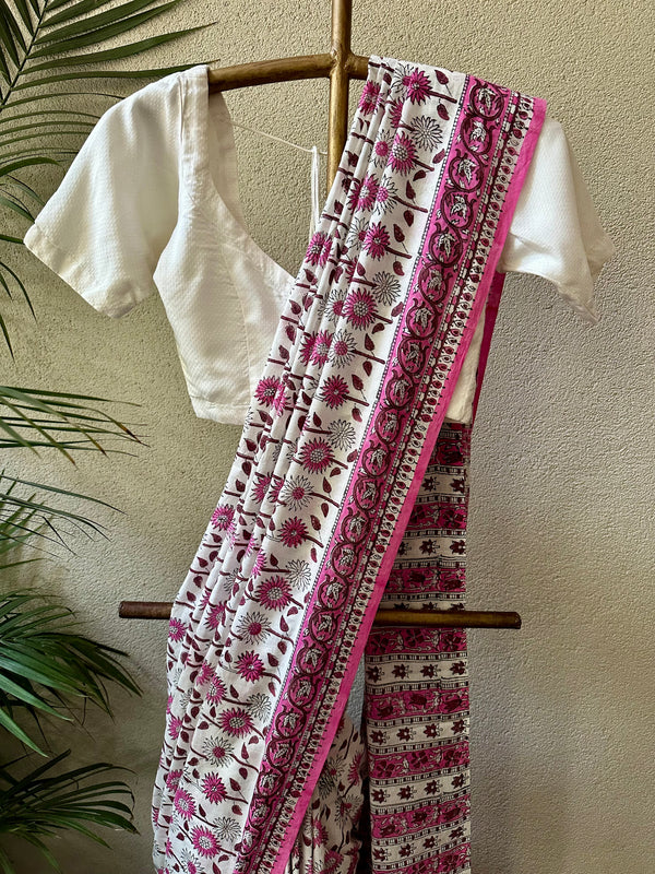 Garner the attention of many by wearing this modal sari from Basho by Ila. Extremely easy to wear surely a head turner. Stitched to perfection in our small workshop in Dehradun Uttarakhand. These are our own designs.