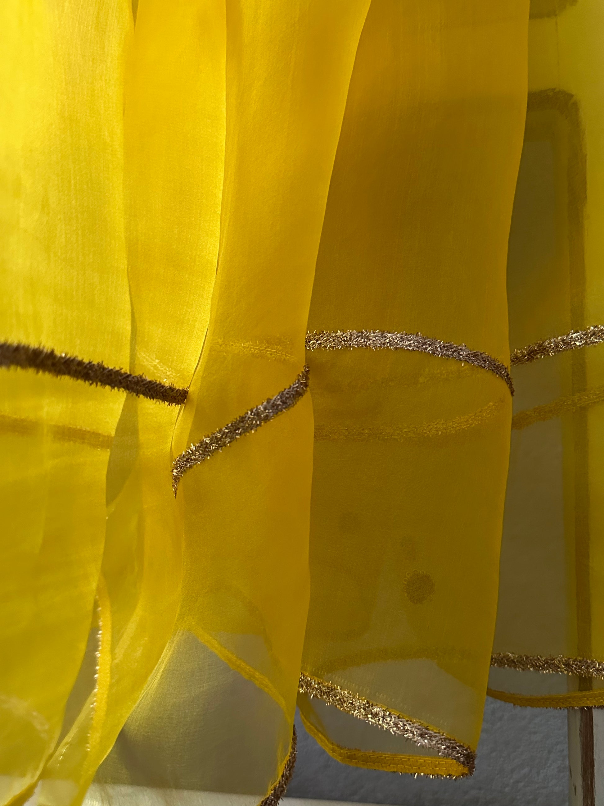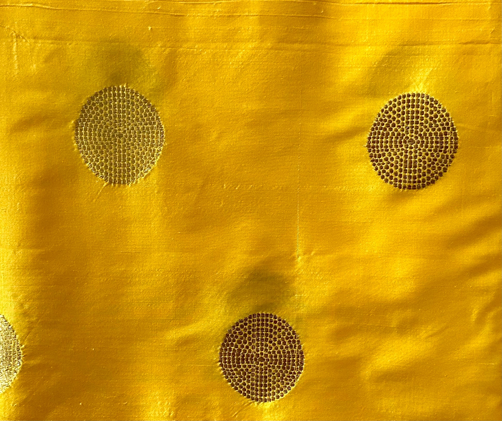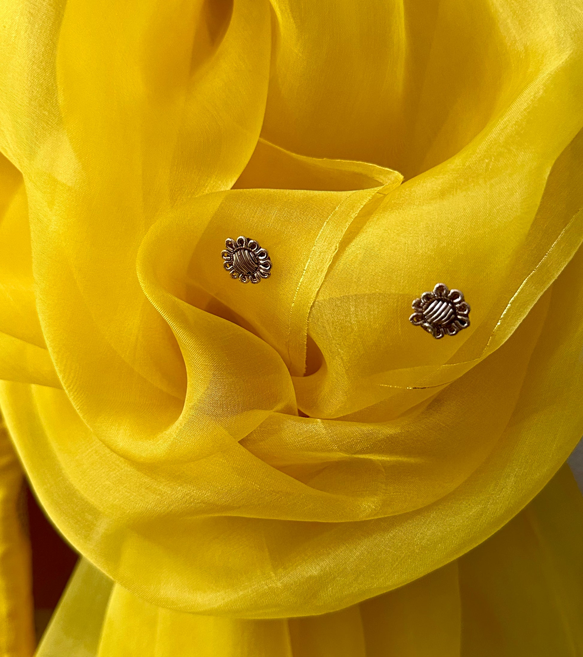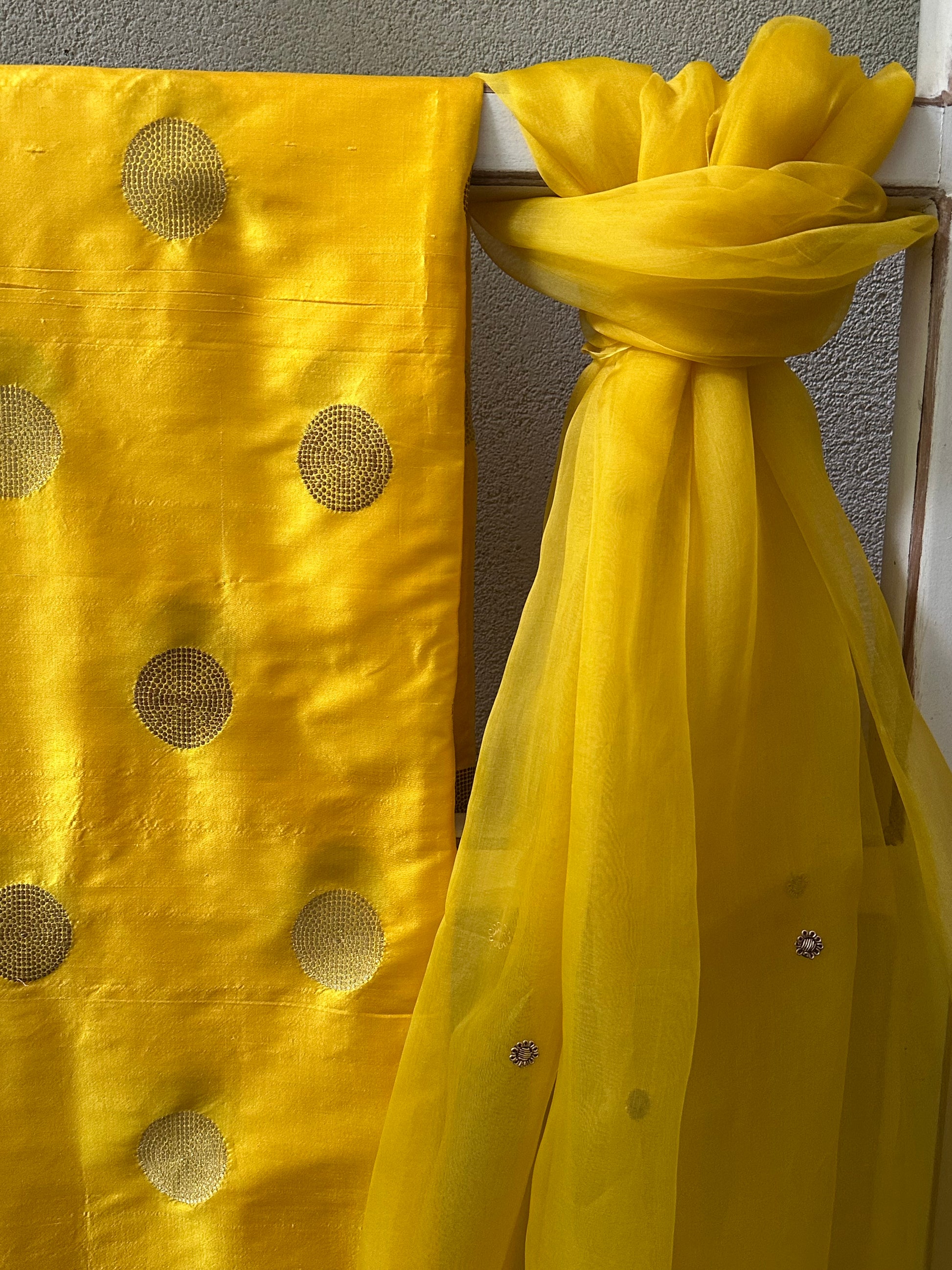 This Banarasi suit set is crafted in pure silk with classic gold buta weaving. It comes with a matching silk organza dupatta finished with delicate lace detailing and subtle dubka work. The fabric has a smooth and rich feel making it suitable for festive wear, weddings, and special occasions.