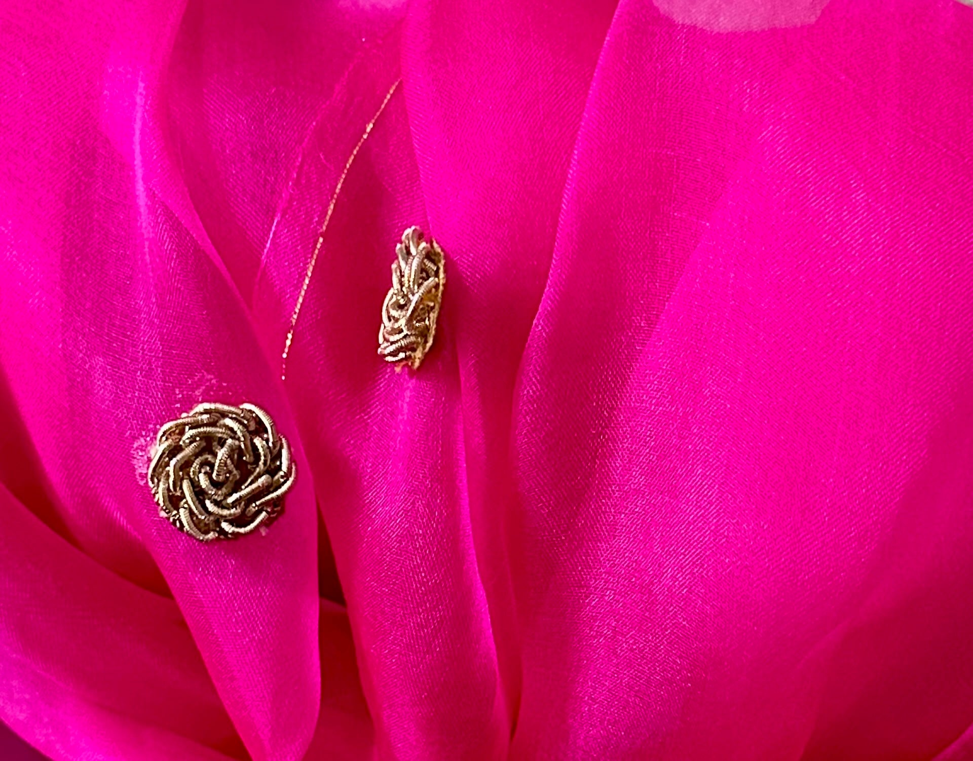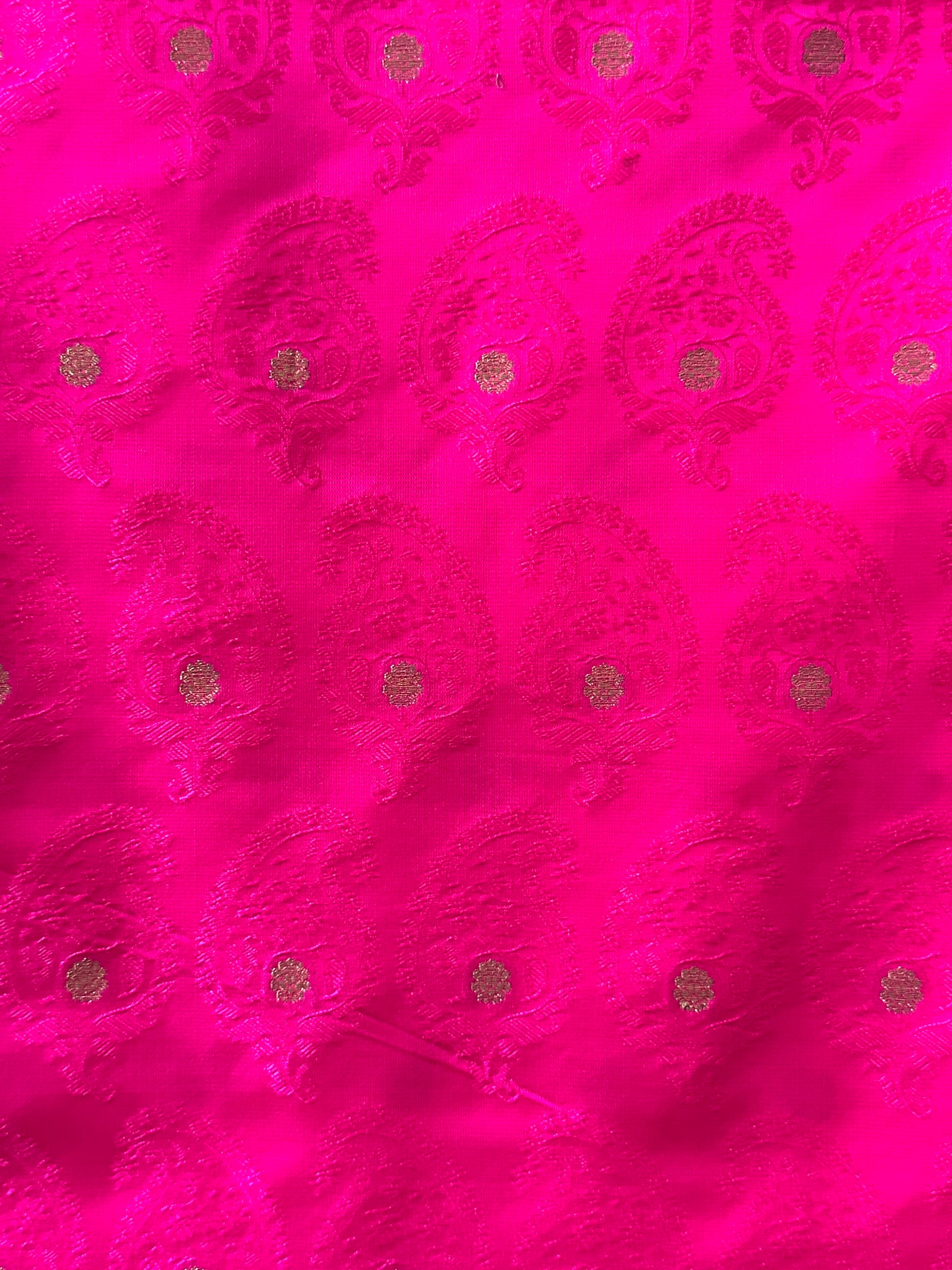 This Banarasi suit set is crafted in pure silk with classic gold buta weaving. It comes with a matching silk organza dupatta finished with delicate lace detailing and subtle dubka work. The fabric has a smooth and rich feel making it suitable for festive wear, weddings, and special occasions.