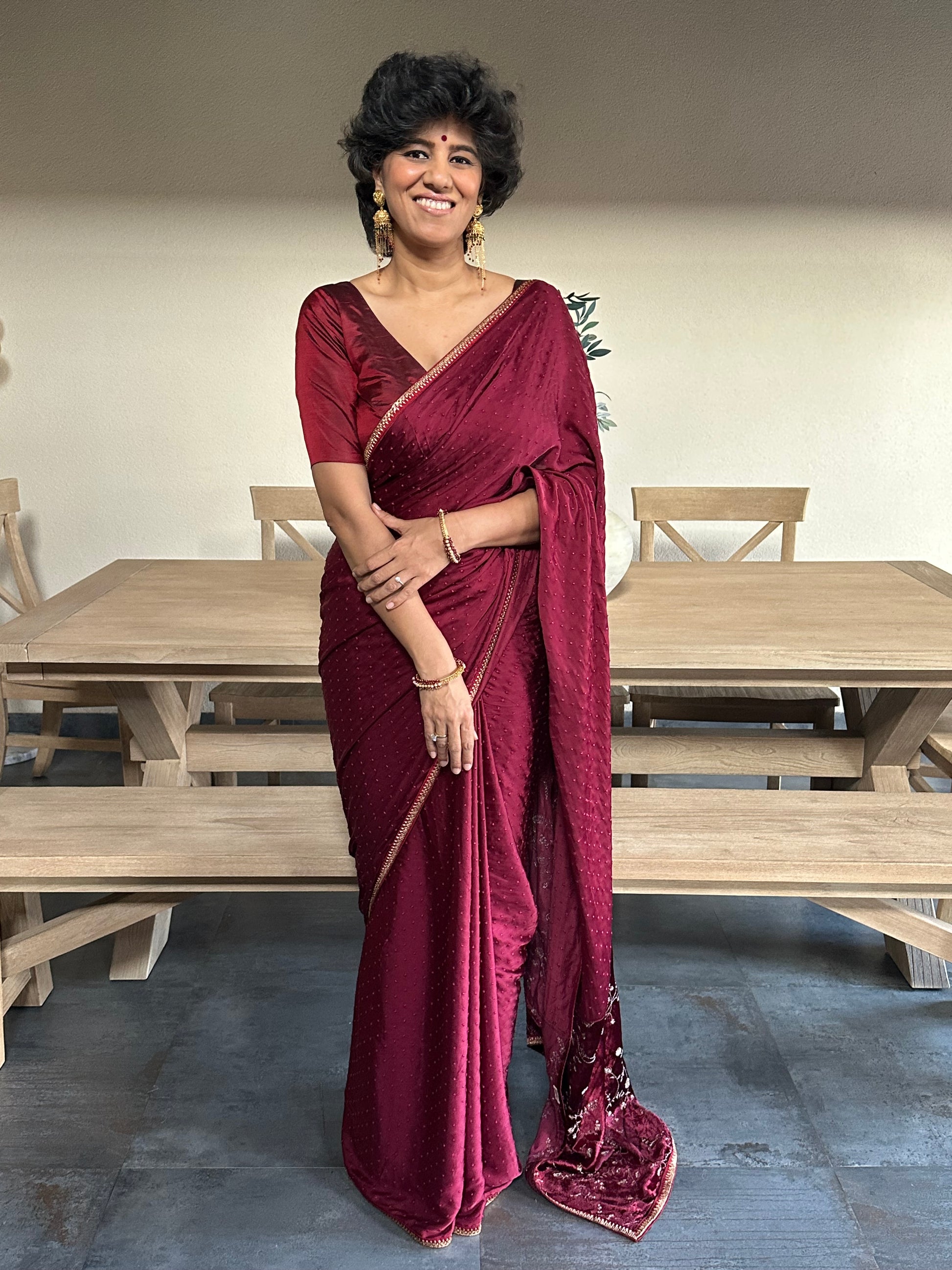 Elegant modal saree featuring delicate lace detailing, a luxurious velvet pallu, velvet blouse, and intricate self-embroidery for a royal look.