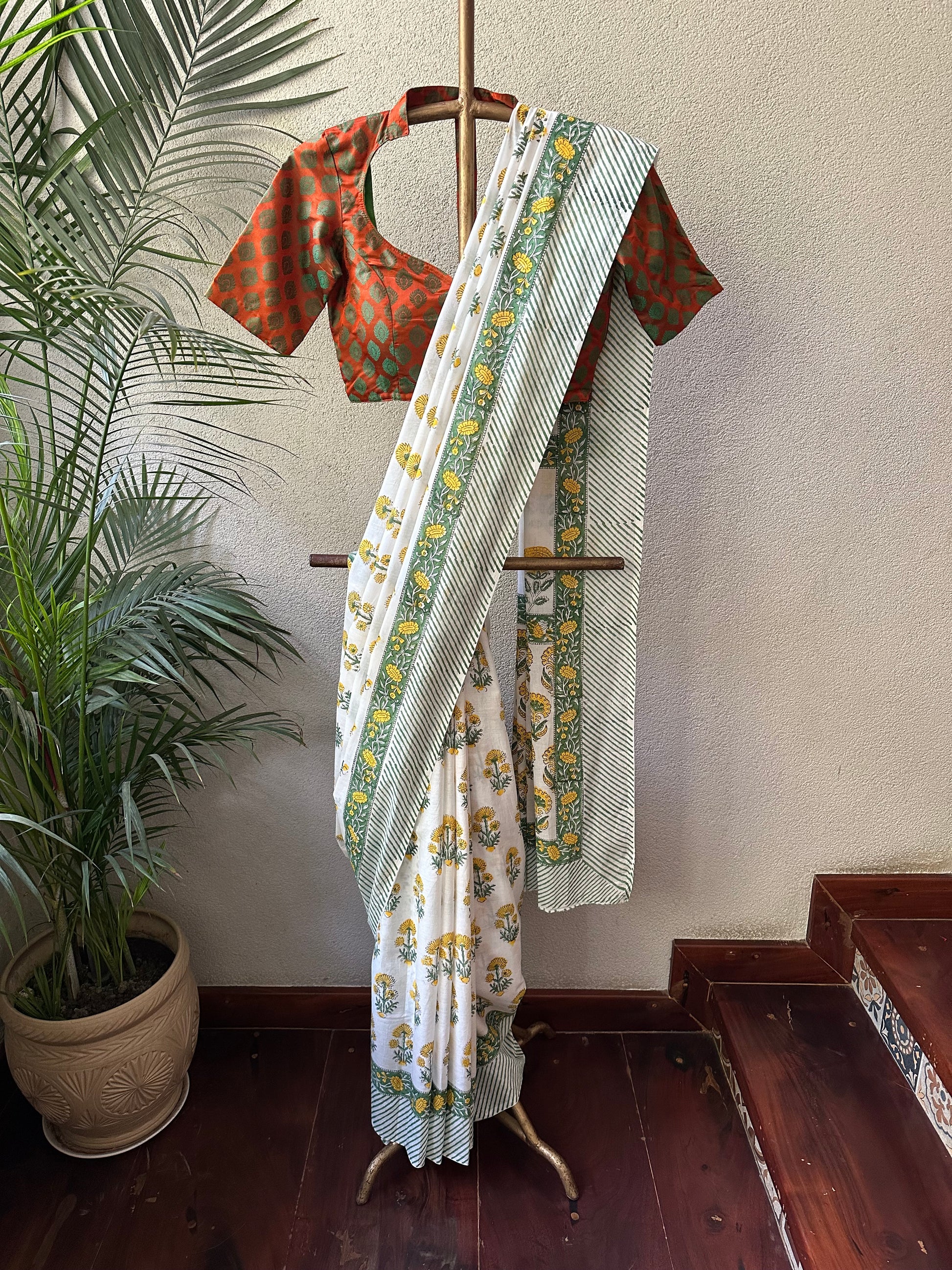 This pure Mul cotton saree is beautifully crafted with traditional Sanganeri cotton block prints. Made from soft, breathable, and lightweight fabric, it offers all-day comfort and an effortless drape, perfect for daily wear and casual outings.