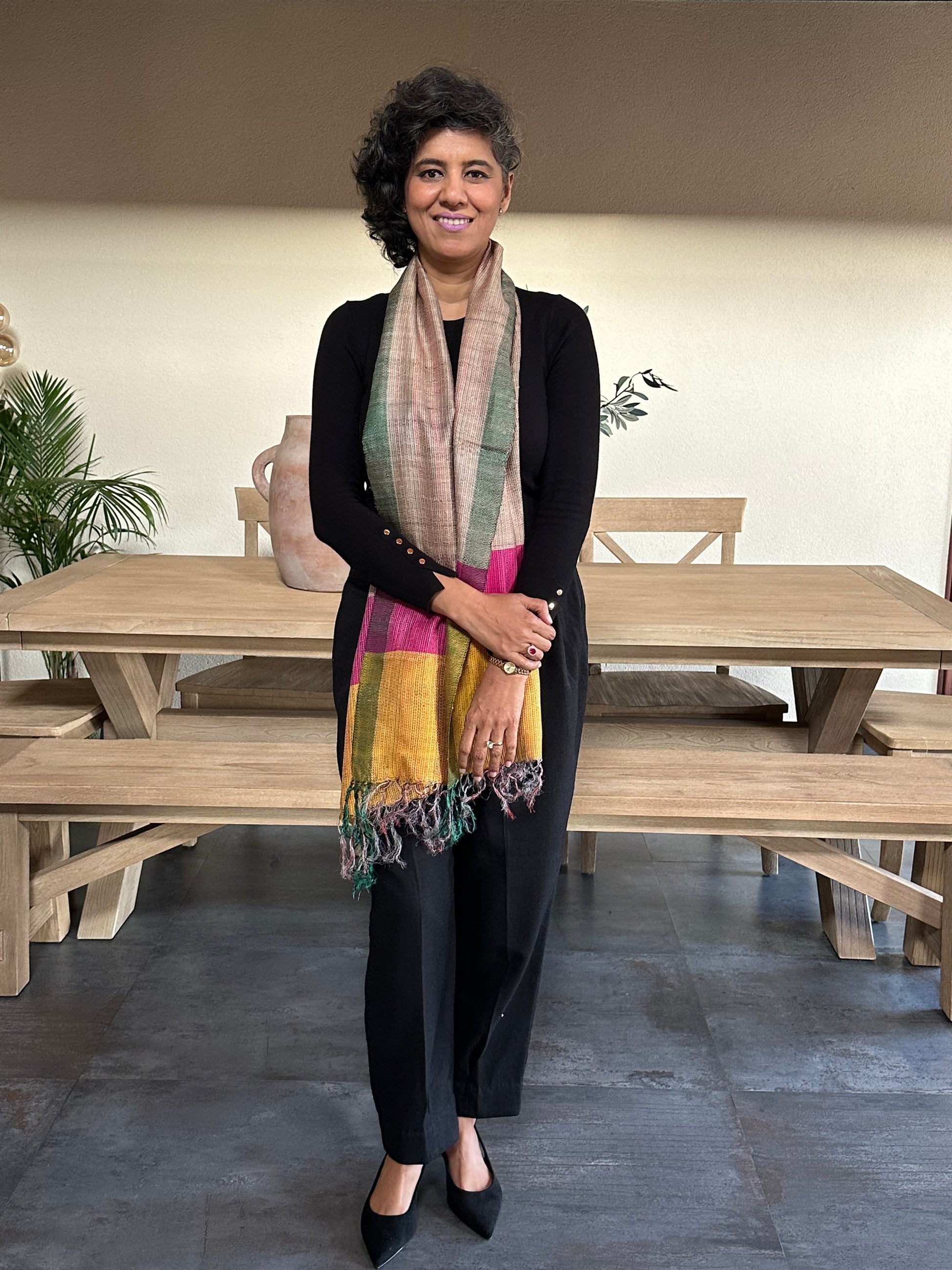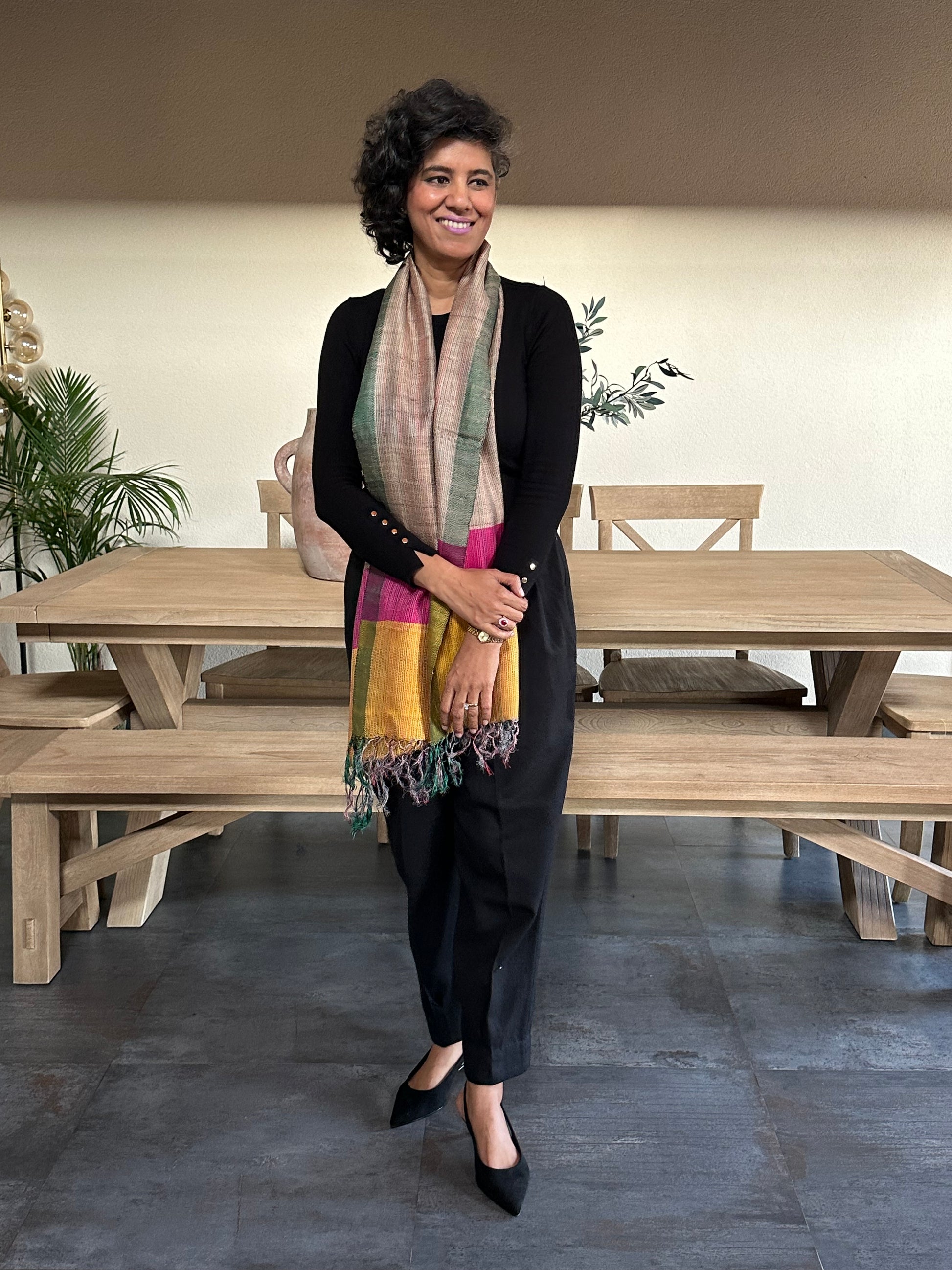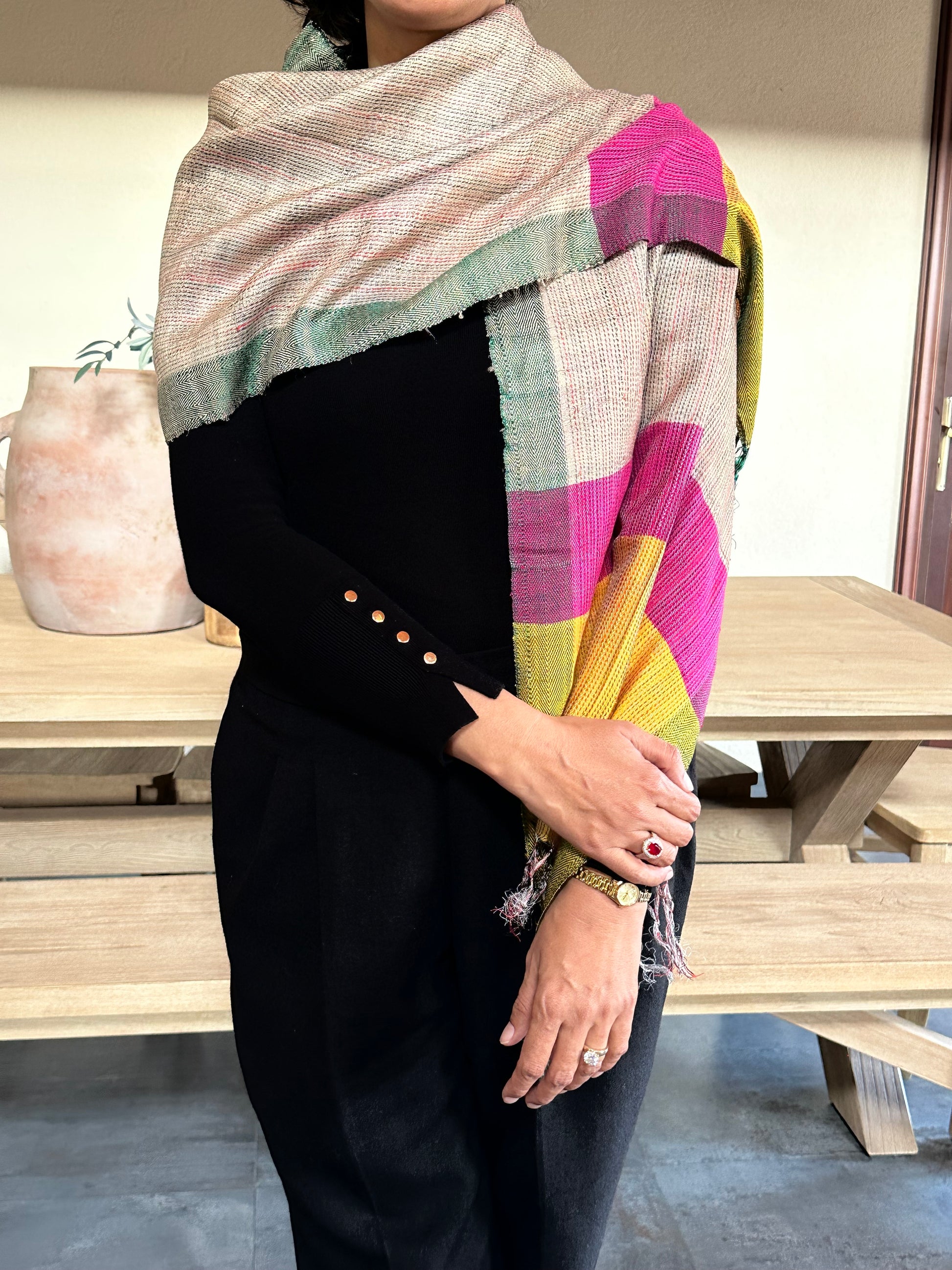 This elegant stole features subtle earthy tones with contrasting color blocks. Lightweight and comfortable, it drapes beautifully and adds a refined touch to everyday and workwear outfits.