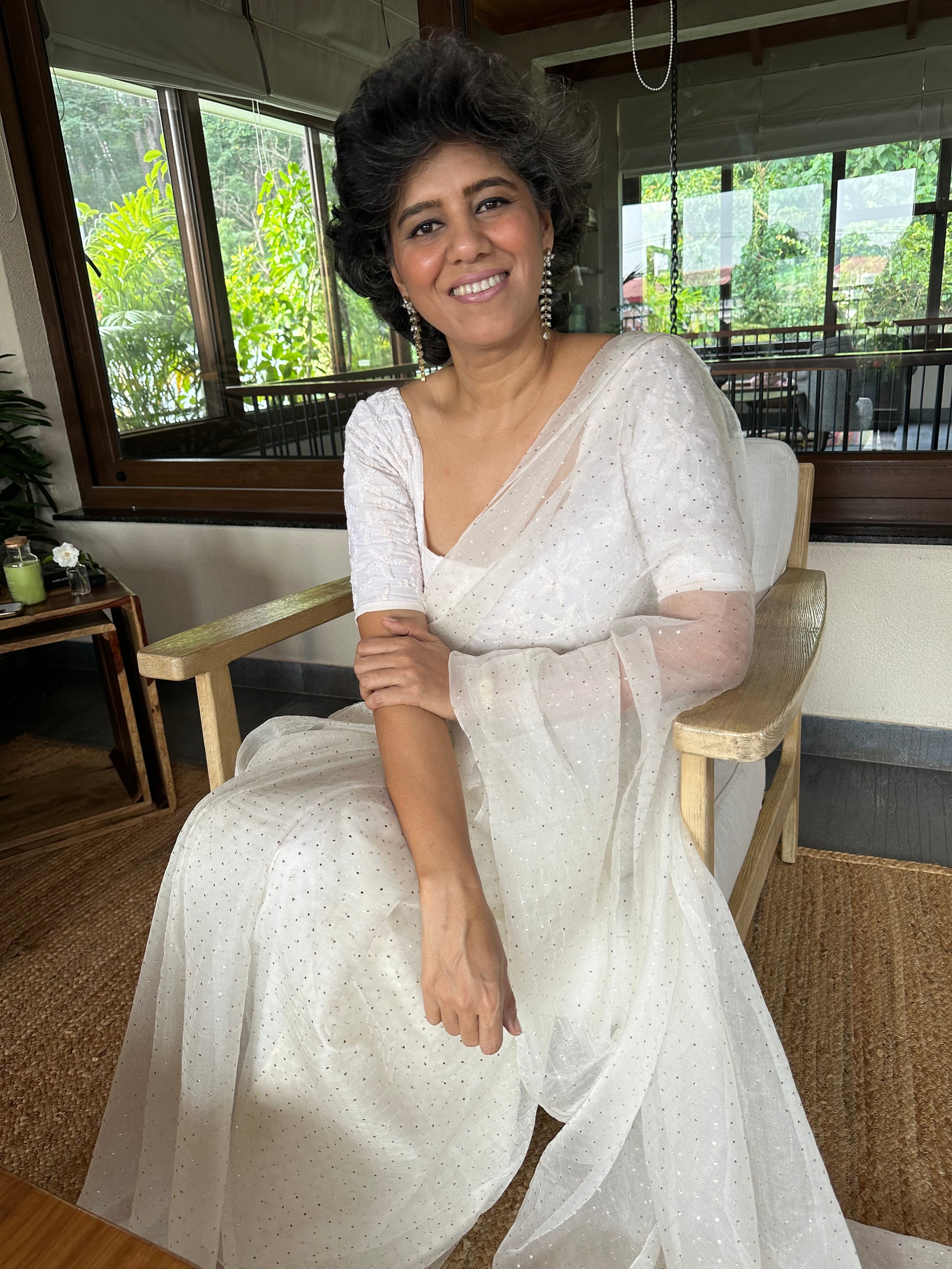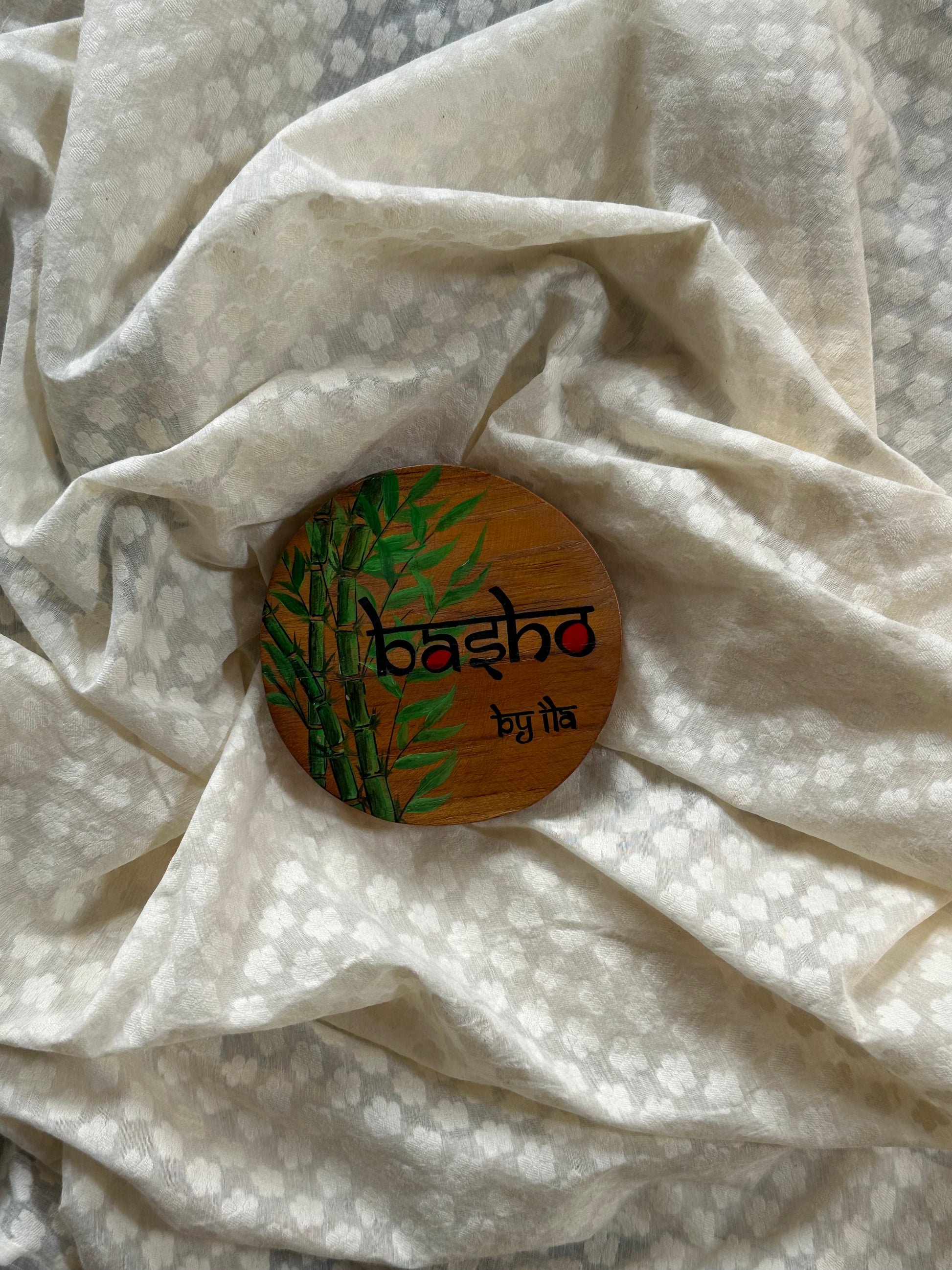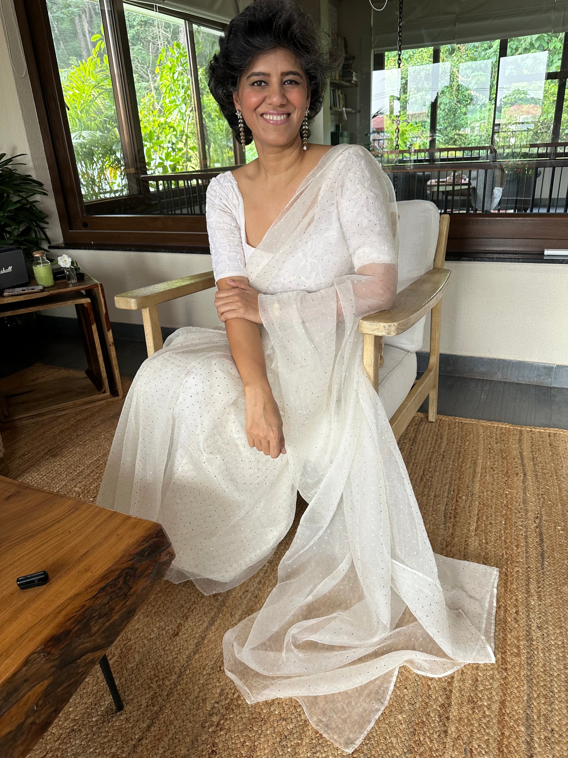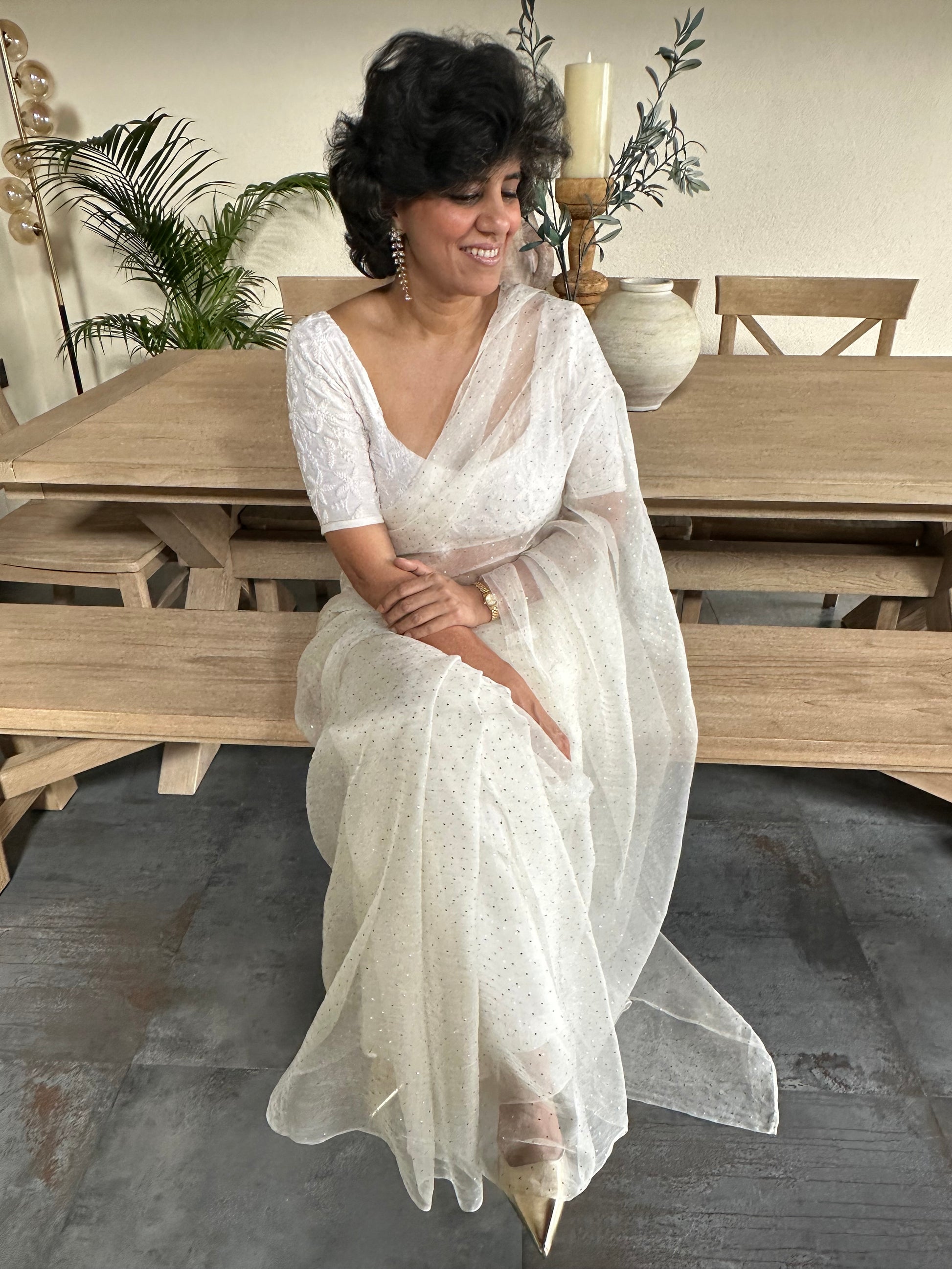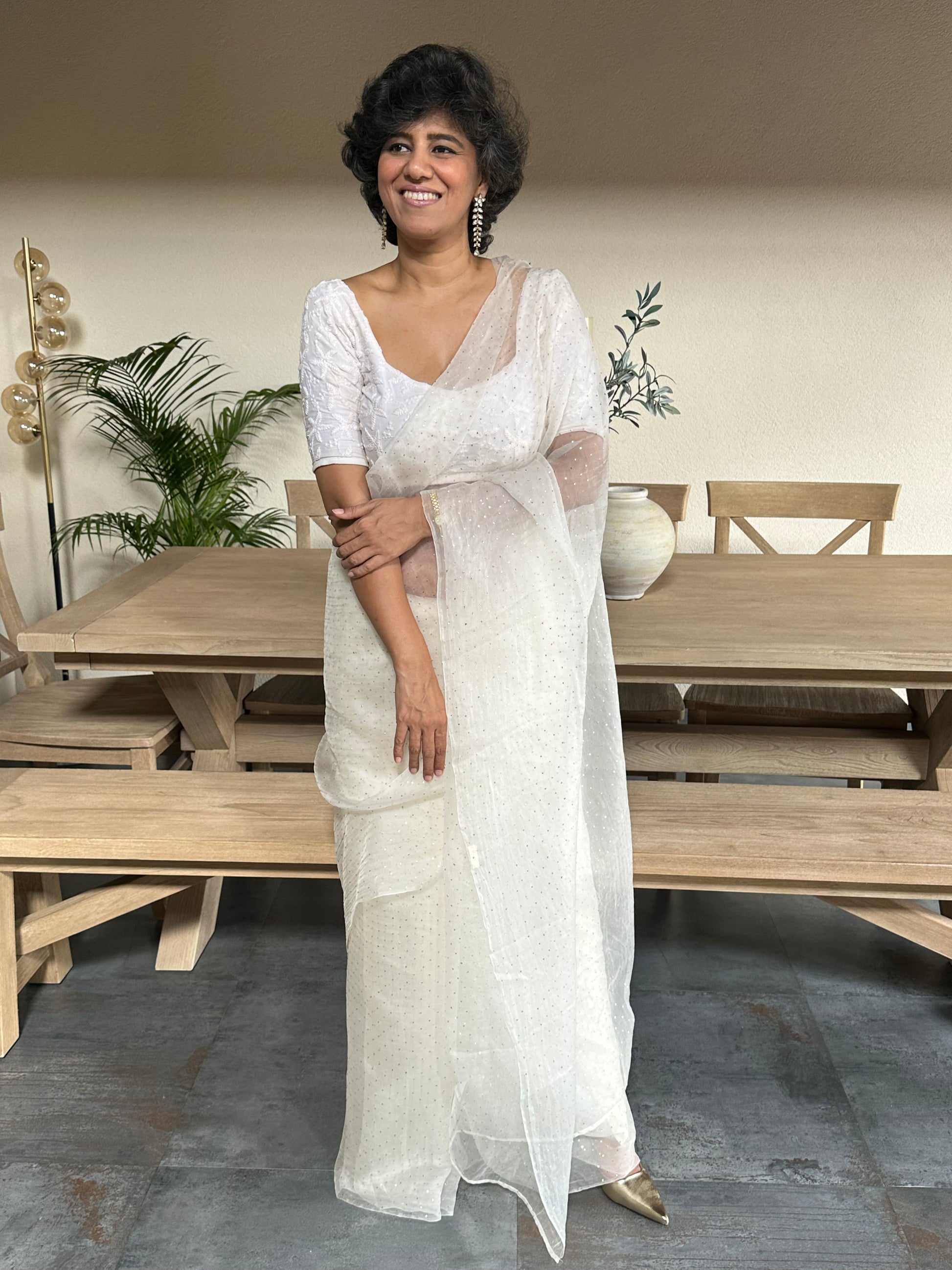 This pure silk organza saree is a timeless piece, delicately adorned with traditional mukesh work. Its sheer elegance and lightweight drape make it perfect for festive and wedding occasions. The fine craftsmanship enhances the luxurious texture of the silk organza, adding a graceful shimmer and sophistication to your wardrobe.